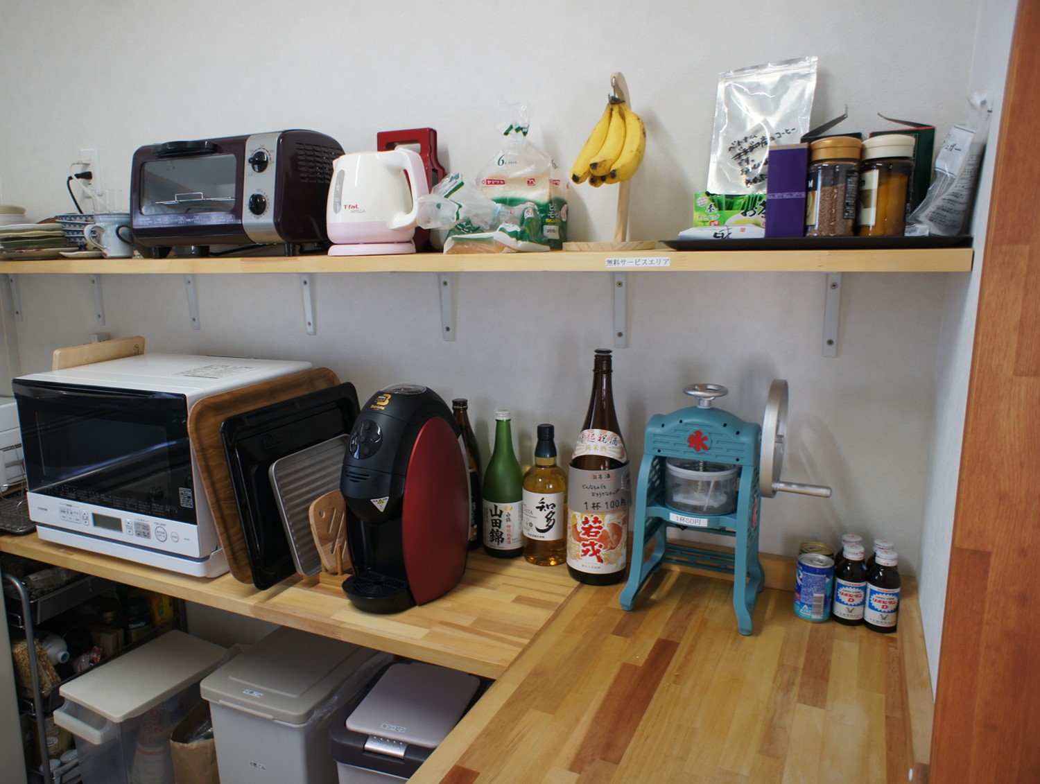 台所棚(コーヒー、紅茶、緑茶無料、朝食に食パン、バナナ等々無料サービス)